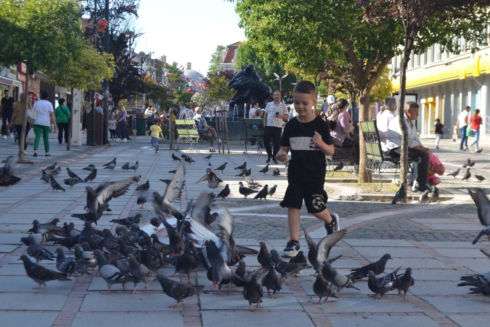Edirne’de Saraçlar Caddesi’nde minik çocuklar güvercinlere yem attı.