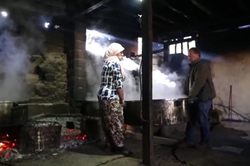 Daha sonra ateş başında dumanın sardığı pekmezhane de kadınlar bir yandan şırayı kepçeyle karıştırırken diğer yandan da kaynayan tavalardaki şıranın köpüğünü almaya özen gösteriyor. Bazı kadınlar da zaman zaman tavaların başında Pomakça türküler seslendirip ortama neşe katıyor.