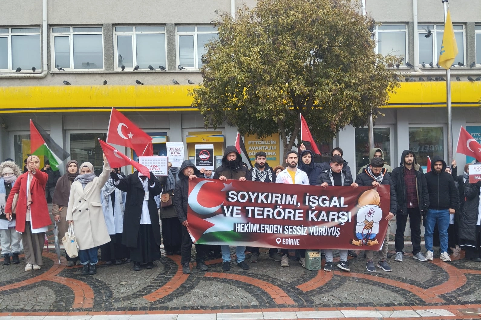 Trakya Üniversitesi Tıp Fakültesi Öğrencileri ve sağlık çalışanları tarafından İsrail’in Gazze işgaline karşı gerçekleştirilen sessiz yürüyüşün 10’uncusu Eski Cami’den başladı. Eski Cami’den Saraçlar Caddesi’ne yürüyüşe katılan öğrenciler adına postane önünde basın açıklaması okundu.