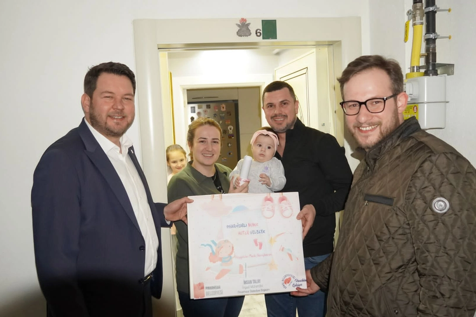 Belediye Başkanı İhsan Talay, proje kapsamında, yeni doğan bebeklerin ailelerini ziyaret ederek, hediye takdim ediyor.