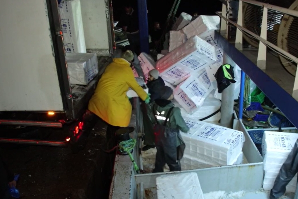 Balıkçı teknelerinde yoğun mesai yaşayan tayfalar, balık dolu kasaları limanda bekleyen kamyon ve tırlara yüklüyor.