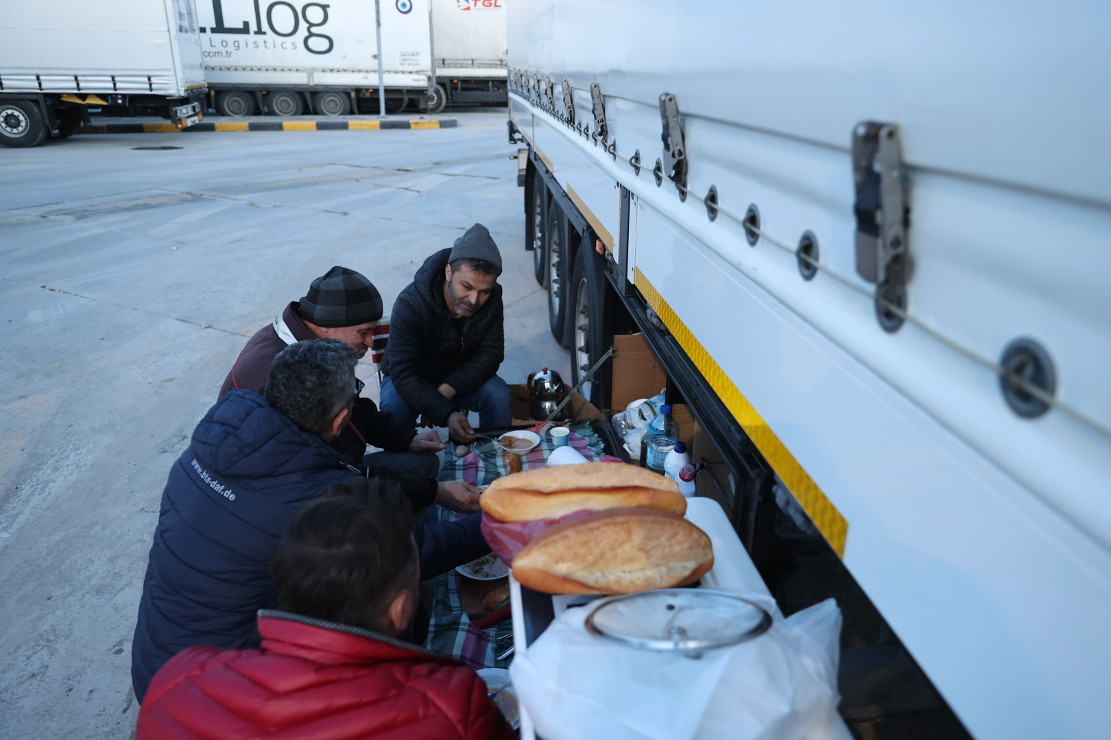 Araçlarının dolaplarına koydukları yiyeceklerle meslektaşlarıyla sofra kuran tır şoförleri, oruçlarını hep birlikte açıyor. İhracata katkıda bulunan tır şoförleri, ramazanı da ailelerinden uzakta geçiriyor.