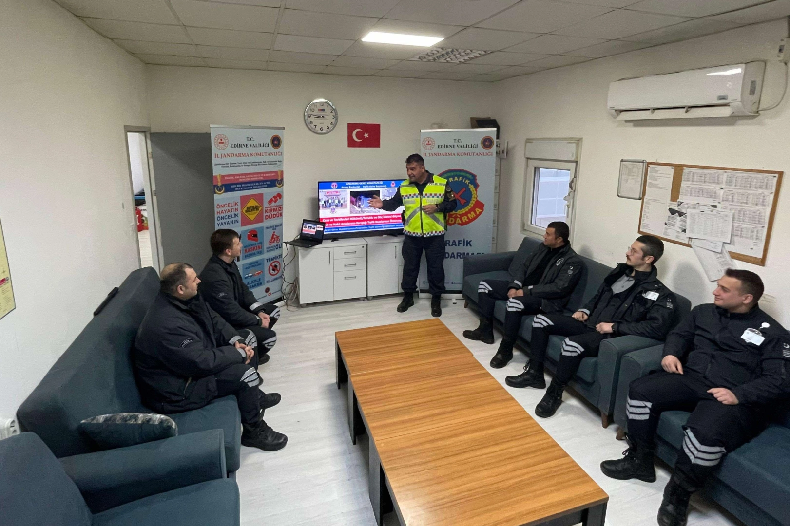 Edirne İl Jandarma Komutanlığı Trafik Jandarması Timleri tarafından Edirne İl Göç İdaresi Müdürlüğünde görevli personellere yönelik, trafik kuralları, kış lastiği ve önemi, kış şartlarında araç kullanımı, güvenli sürüş, geçiş üstünlüğü, mevsimsel araç lastik ve bakımı, emniyet kemeri kullanımı ve önemi konularında eğitim ve bilgilendirme faaliyeti gerçekleştirildi.