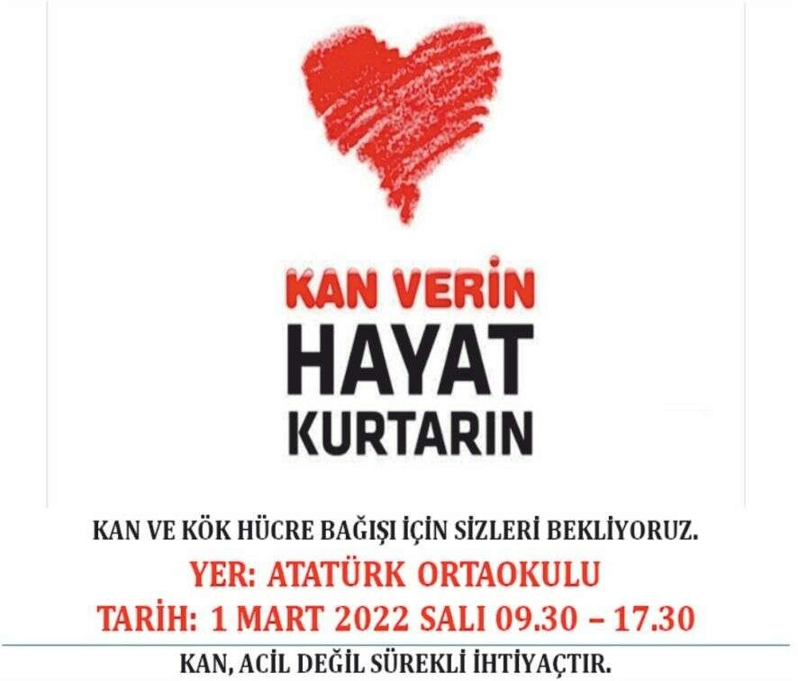 Konu ile ilgili olarak yapılan açıklamada; “il Milli Eğitim Müdürlüğümüzün 2023 Vizyon Projelerinden Bir Bağış Üç Hayat Projesi Kapsamında ilçe Milli Eğitim Müdürlüğümüz koordinesinde ilçemiz Atatürk Ortaokulu bahçesinde 01 Mart 2022 Salı Günü Kan Bağışı Kampanyası düzenlenecektir. Kan Bağışımız saat 09:00-17:30 saatleri arasında yapılacaktır. Kan Bağışı Kampanyasına desteklerinizi bekliyoruz.” denildi.