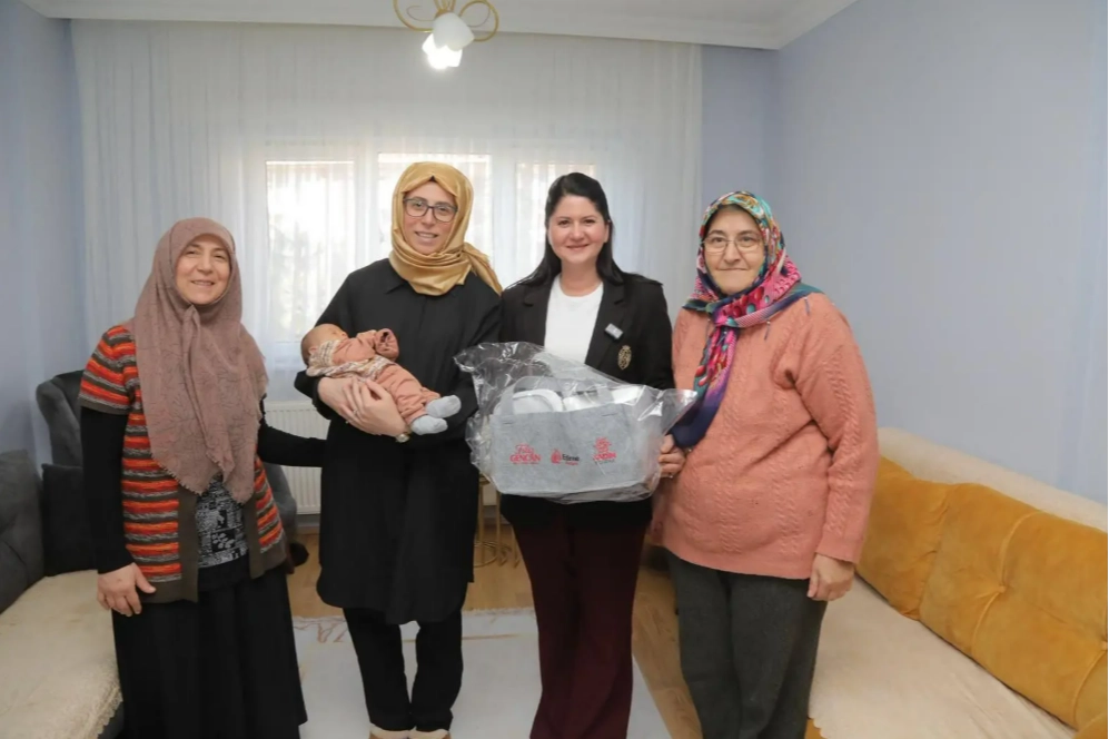 Edirne Belediye Başkanı Filiz Gencan, Edirne Belediyesi Kadın ve Aile Hizmetleri Müdürlüğü bünyesinde başlatılan “Yenidoğan Paketi” projesinin ilk uygulamasını Kurtuluş Mahallesi’nde gerçekleştirdi. Başkan Gencan, Efehan bebeğin ailesini ziyaret ederek hazırlanan destek paketini aileye teslim etti ve mutluluklarına ortak oldu.