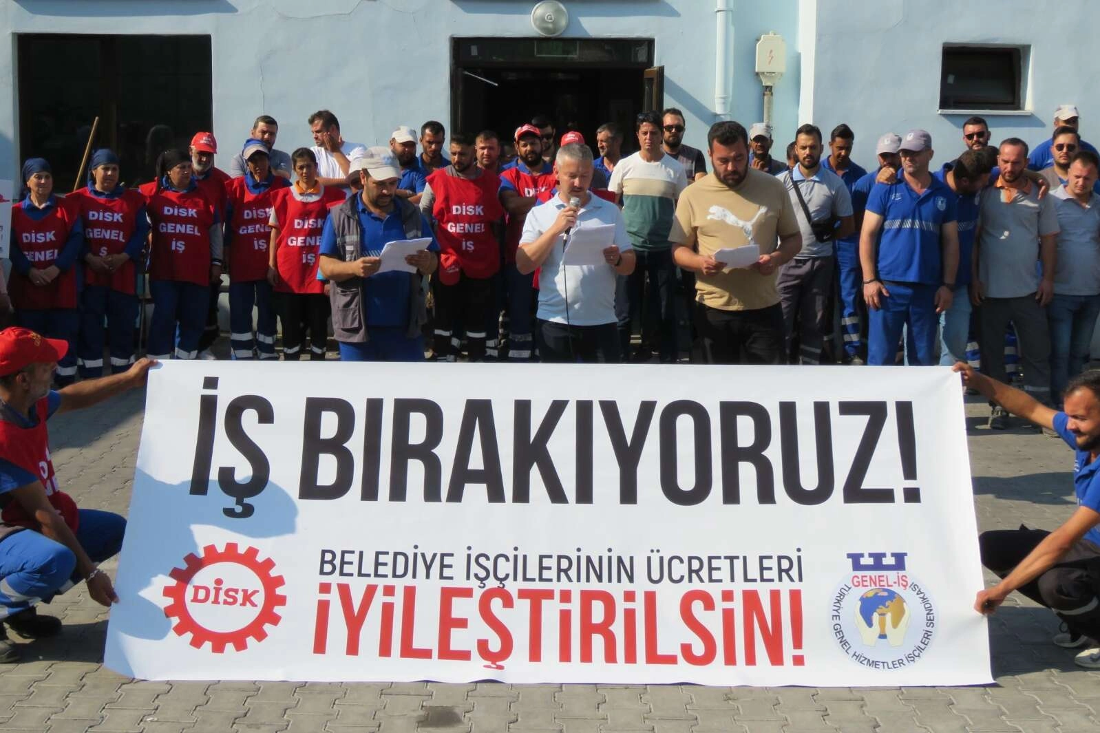 İşçiler, burada "İş bırakıyoruz, belediye işçilerinin ücretleri iyileştirilsin" yazılı pankart açtı.