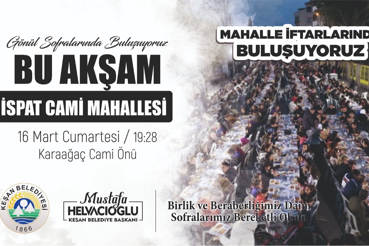 Edirne’nin Keşan ilçesinde Belediye Başkanı Mustafa Helvacıoğlu, bu akşam İspat Cami Mahallesi’nde düzenlenecek olan toplu iftar programına tüm vatandaşları davet etti. Helvacıoğlu yaptığı paylaşımda: “Gönül soframızı bu akşam İspat Cami Mahallemizde kuruyoruz. İftarımıza davetlisiniz. Ramazan ayının bereketini hep birlikte yaşıyoruz. Soframız bir, gönlümüz bir” ifadelerine yer verdi.