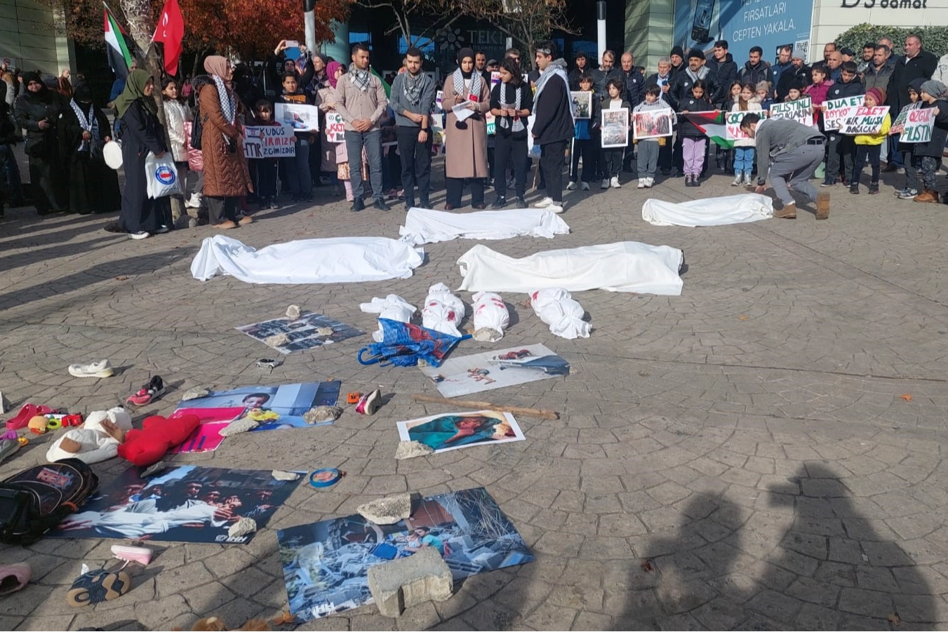İsrail’in Gazze’ye saldırılarına yönelik tepkiler çığ gibi büyüyemeye devam ederken Tekirdağ’ın Süleymanpaşa ilçesinde de her hafta İsrail’in hain saldırılarına yönelik eylemler yapılıyor. İlçede bulunan Köprübaşında bir AVM’nin önünde aileleriyle toplanan vatandaşlar İsrail’in Gazze’ye yönelik saldırılarını protesto ederek saldırılardan etkilenen çocukların fotoğrafları, çanta oyuncak gibi birçok malzeme yere serildi. İsrail’in çocuklara saldırılara dikkat çekilmesi amacıyla malzemelerin hemen yanı başına ise birkaç çocuk yere yatarak üzerlerine ise beyaz örtü serildi.