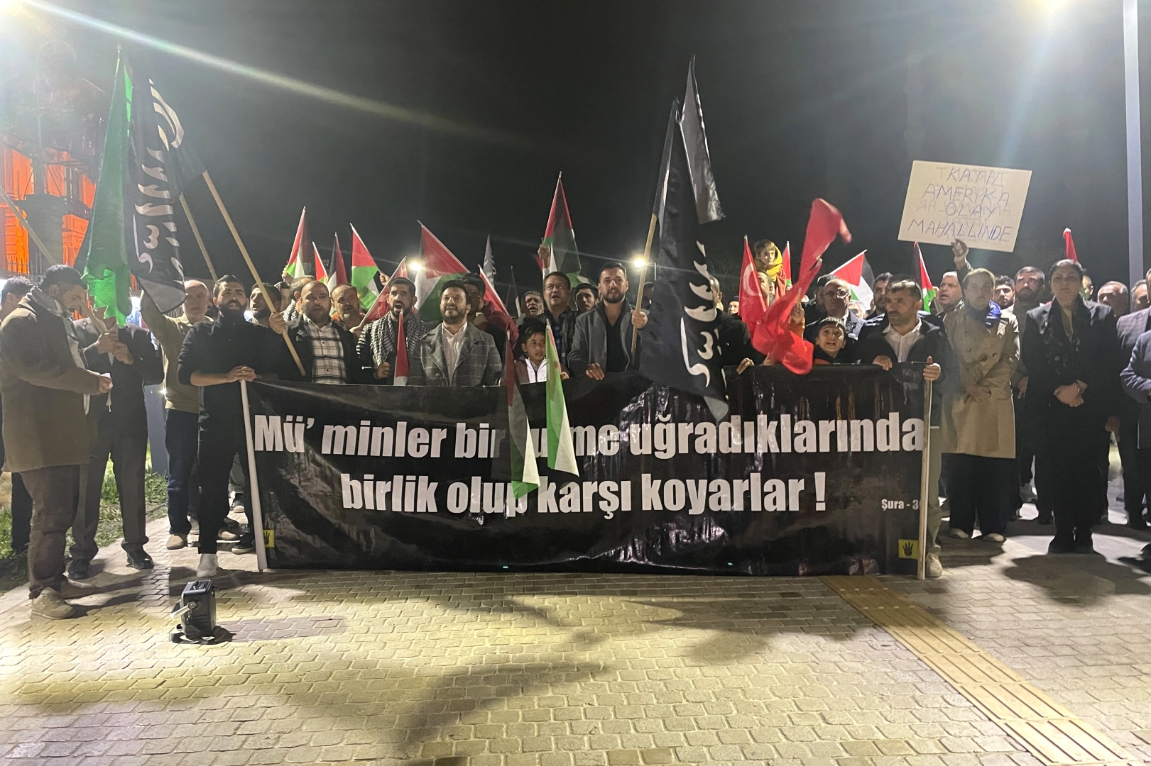Türk bayrağı ve Filistin bayrağı taşıyan grup İsrail ve ABD karşıtı slogan attı.