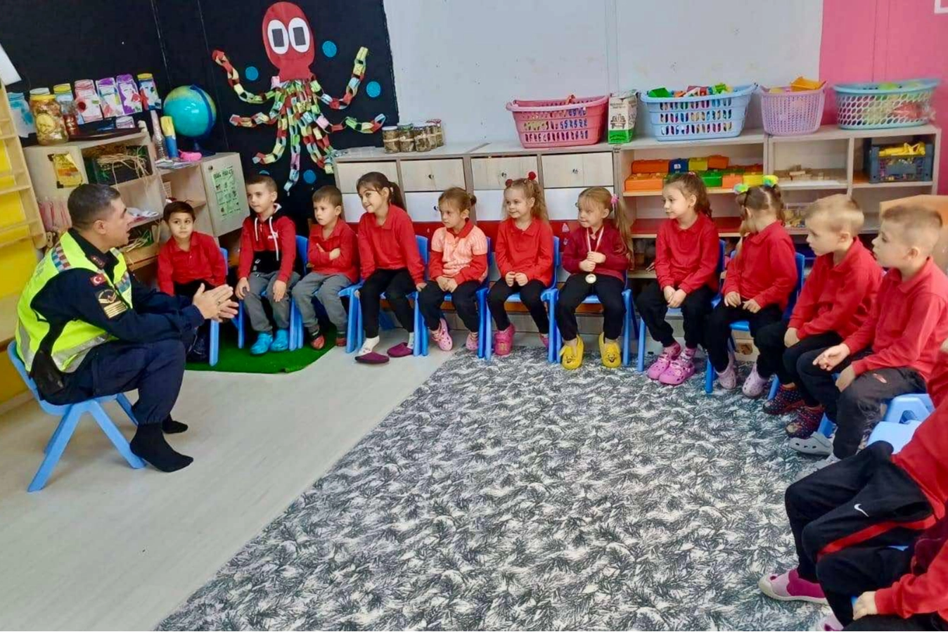 Edirne İl Jandarma Komutanlığı Trafik Jandarması Timleri, Edirne’nin İpsala ilçesine bağlı Esetçe beldesinde bulunan Suzan Demirci Çağdaş Yaşam Anaokulu'ndaki öğrencilere trafik konularında bilgilendirme yaparak, Trafik Jandarmasının kullandığı araç ve gereçleri tanıttı.