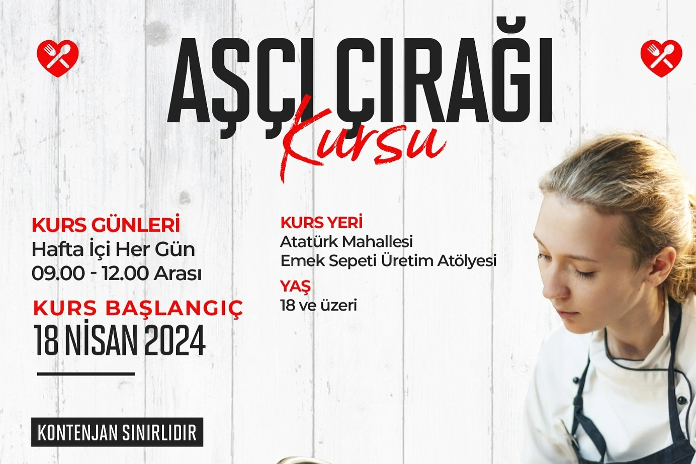 Tekirdağ’ın Kapaklı ilçesinde Kapaklı Belediyesi bünyesinde "Aşçı Çırağı Kursu" adı altında düzenlenecek olan program, Emek Sepeti Üretim Atölyesi'nde gerçekleştirilecek. Kursun başlangıç tarihi 18 Nisan olarak belirlenirken, başvurular için ise 444 80 59 numaralı telefondan bilgi alınabileceği bildirildi. Kurs kapsamında aşçılık alanında temel bilgi ve becerileri edinmek isteyenlerin başvuruları bekleniyor.