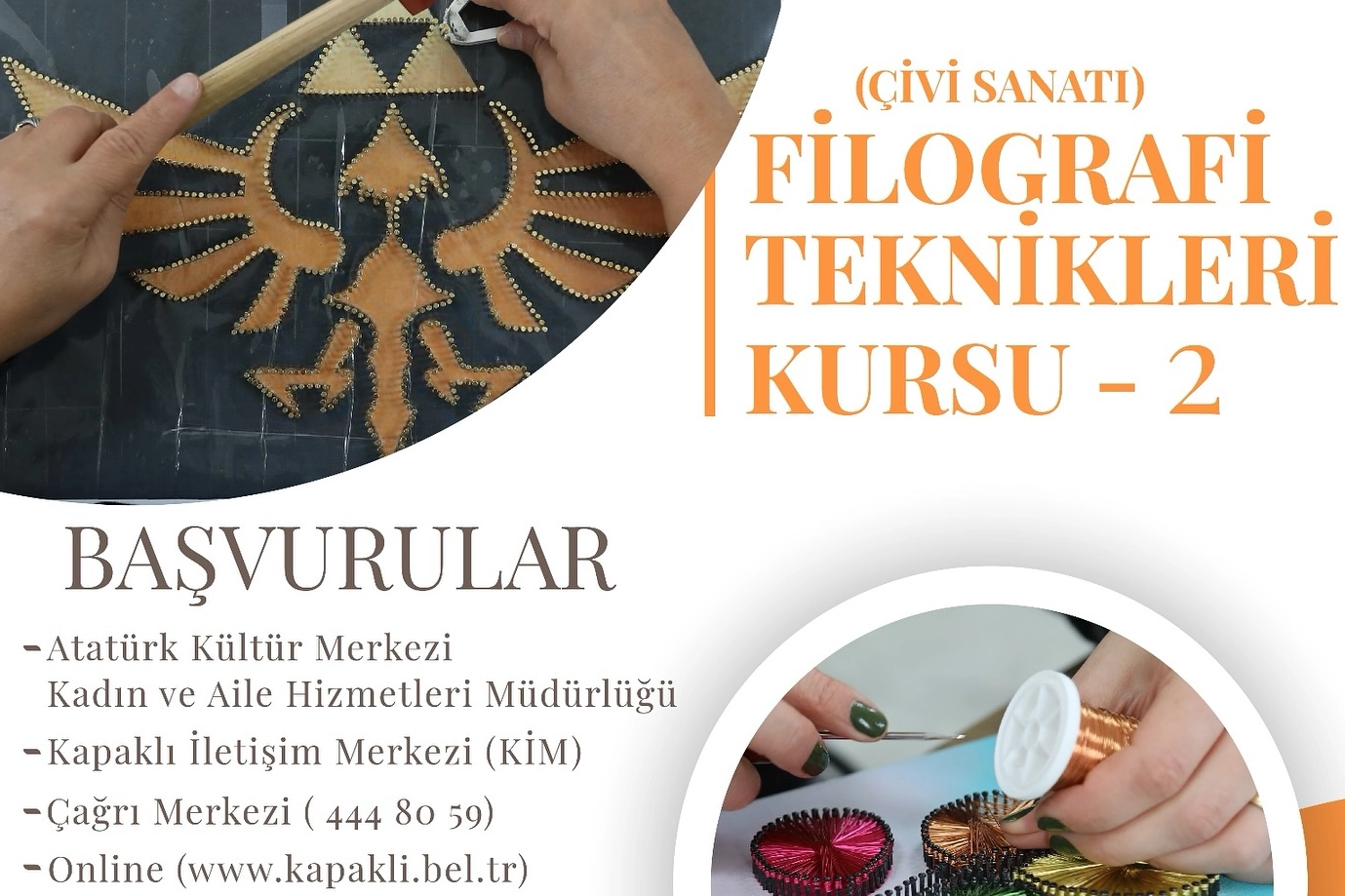 Tekirdağ Kapaklı Belediyesi, sosyal medyadan yaptığı paylaşımda Çivi sanatı Filografi Teknikleri Kursu-2 başvurularının başladığını açıkladı.
