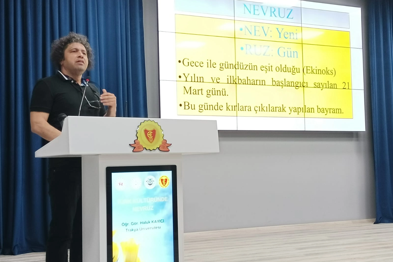 Trakya Üniversitesi Öğretim Görevlisi Haluk Kayıcı, Edirne Lisesi’nde düzenlenen “Türk Kültüründe Nevruz” konferansında Nevruz Bayramı’nın anlamı ve önemini anlattı.