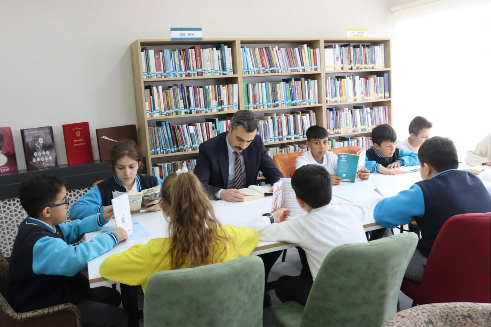 Kaymakam Okur, Kütüphane Haftası kapsamında 2023 yılında en çok ödünç kitap alan kullanıcı Enis Emre Zavrak'a ‘Kitap Kurdu Belgesi’ takdim ederek öğrenciler ile birlikte kitap okuma etkinliğine katıldı.