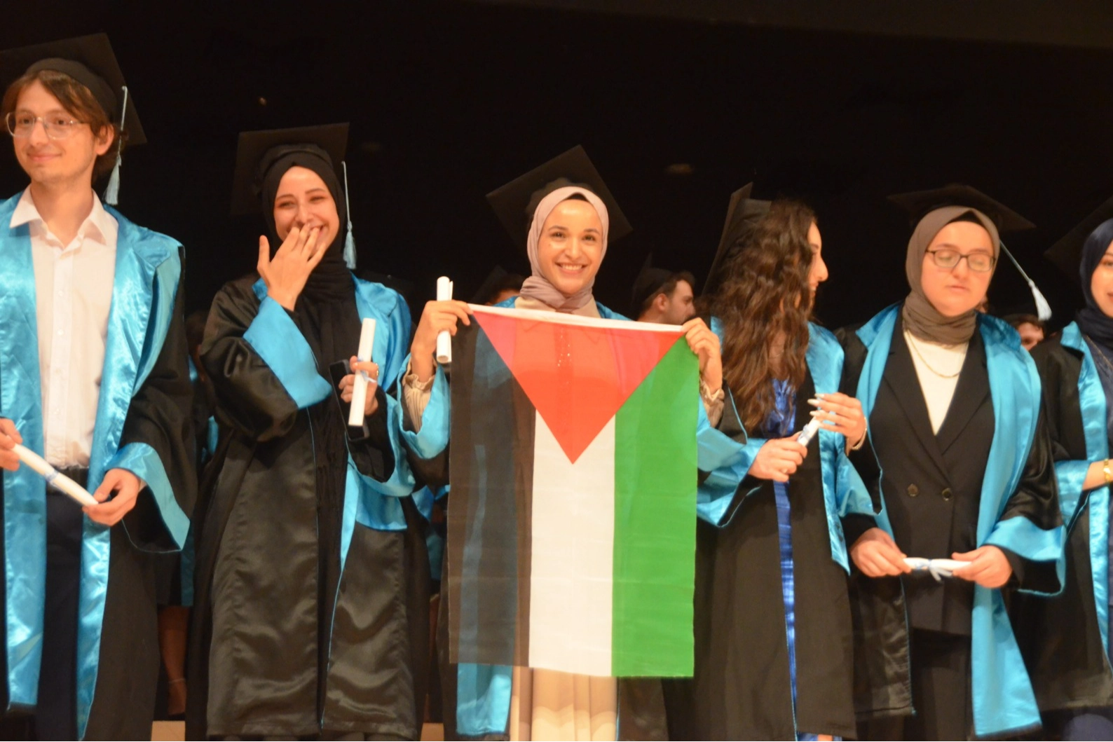Salan, “Bilgisayar Programcılığı Programı’ndan mezun olan Edanur Salan, “Mezuniyet bizim için çok önemli ama biz Filistin’de yaşanan dramı unutmayacağız, unutturmayacağız. Ben bunun bir göstergesi olarak Filistin Bayrağıyla sahneye çıkmak istedim. Filistin’de okumak isteyen, mezun olma hali olan binlerce kardeşimiz var. Ne söylesem hiçbir kelime buna yetmeyecek. En azından bazı şeyleri fiilen yapamıyoruz ama yapacağımız bir hareket, bir gösteri bazılarına ön ayak olabilir. Ya da onlara bir moral, motivasyon olabilir. Ben de buna bir öncülük etmek için bu şekilde bir karar aldım” dedi.