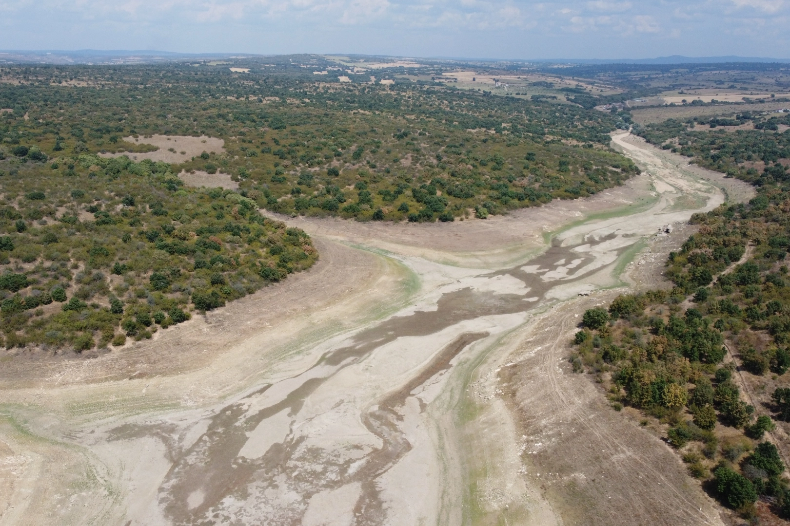 Edirne'de etkili olan kuraklık ve aşırı sıcaklara bağlı yaşanan buharlaşma nedeniyle 6 bin dönüm tarım arazisini sulayan Keramettin Göleti dip seviyeyi gördü.