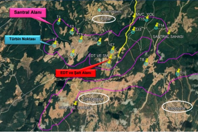 Projenin ÇED başvuru dosyasına göre; proje kapsamında 3 köyün sınırları içinde yer alan 2545,08 hektarlık santral sahasında toplam 15 adet rüzgâr türbini ve EDT kurulacak. Projedeki 9 numaralı türbin Gökçetepe köyüne yaklaşık bin 800 metre, 10 numaralı türbin Sazlıdere köyüne yaklaşık bin 900 metre, 6 numaralı türbin ise Pırnar köyüne yaklaşık bin 500 metre mesafede yer alıyor.