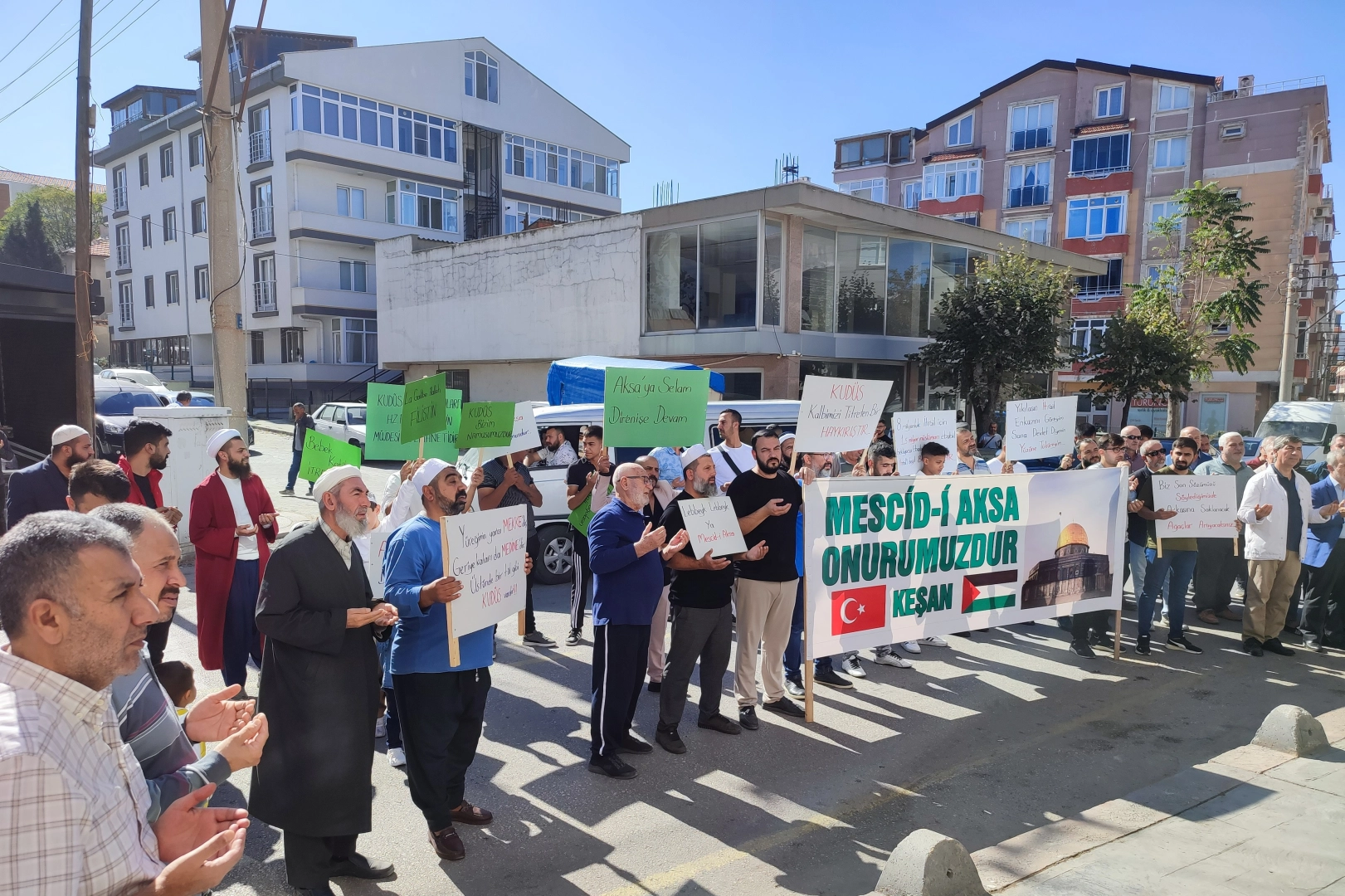 Yörüker Camii önünde toplanan cemaat, İsrail'in Filistin'e yaptığı saldırıları protesto etti. Cami cemaati adına basın açıklaması yapan Nizamettin Tezmen, "Bugün burada konuşacaklarımız belki de hemen hemen herkesin bildiği ve yüreğinde bir yara olarak taşıdığı meselelerdir. Bizlerin burada seslenişe geçişimizin asıl gayesi, eyleme geçme isteğimizdir. Çünkü bugün, Türk milleti taşına altına elini koymazsa orta doğuda herkesin gözlerinin önünde devam eden insanlık dışı katil, eli kanlı terör devletini eli kolu bağlı bir şekilde tüm dünya izleyecek. Çünkü Filistin'de umutlu gözlerle beklenen halk şanlı Türk milletidir. Buradan umutlu gözlerle bizden destek bekleyen ümmetin onuru, ilk kıblemiz Mescid'i Aksa'nın şerefli bekçileri, Allah için cihad eden Filistinli din kardeşim, korkma, üzülme, paniğe kapılma Allah bizimle beraberdir. Kafirler, ağızlarıyla Allah'ın nurunu söndürmek istiyor. Halbuki kafirler istemese de Allah nurunu tamamlayacaktır. Ey İsrail; şuanda ufacık bir yere sığdıramadığın Filistin ile savaşıyorsun. Bizler Müslümanlar olarak son sözümüzü söylemedik. Bu zamana kadar dualar ile manen yanında olduğumuz Filistin'in devletimizin de desteği ile silahlanarak ilk kıblemiz Mescid-i Aksa için seve seve Allah uğrunda seve seve şehit olmaya Keşan olarak biz de varız. Bu memleketin ne Nene Hatunları, ne de Seyit Onbaşı'ları biter. Gerekirse bir ölürüz ama küllerimizden bin diriliriz. Onlar ne yaparsa yapsın Allah nurunu tamamlayacaktır" dedi. Açıklamanın ardından, Yörüker Cami İmam Hatibi Mustafa Kabakçılı tarafından, İsrail'in saldırıları sonucu hayatlarını kaybeden Filistinliler için gıyabi cenaze namazı kıldırıldı. Namazın ardından Filistin'de hayatlarını kaybedenlere dua edildi.