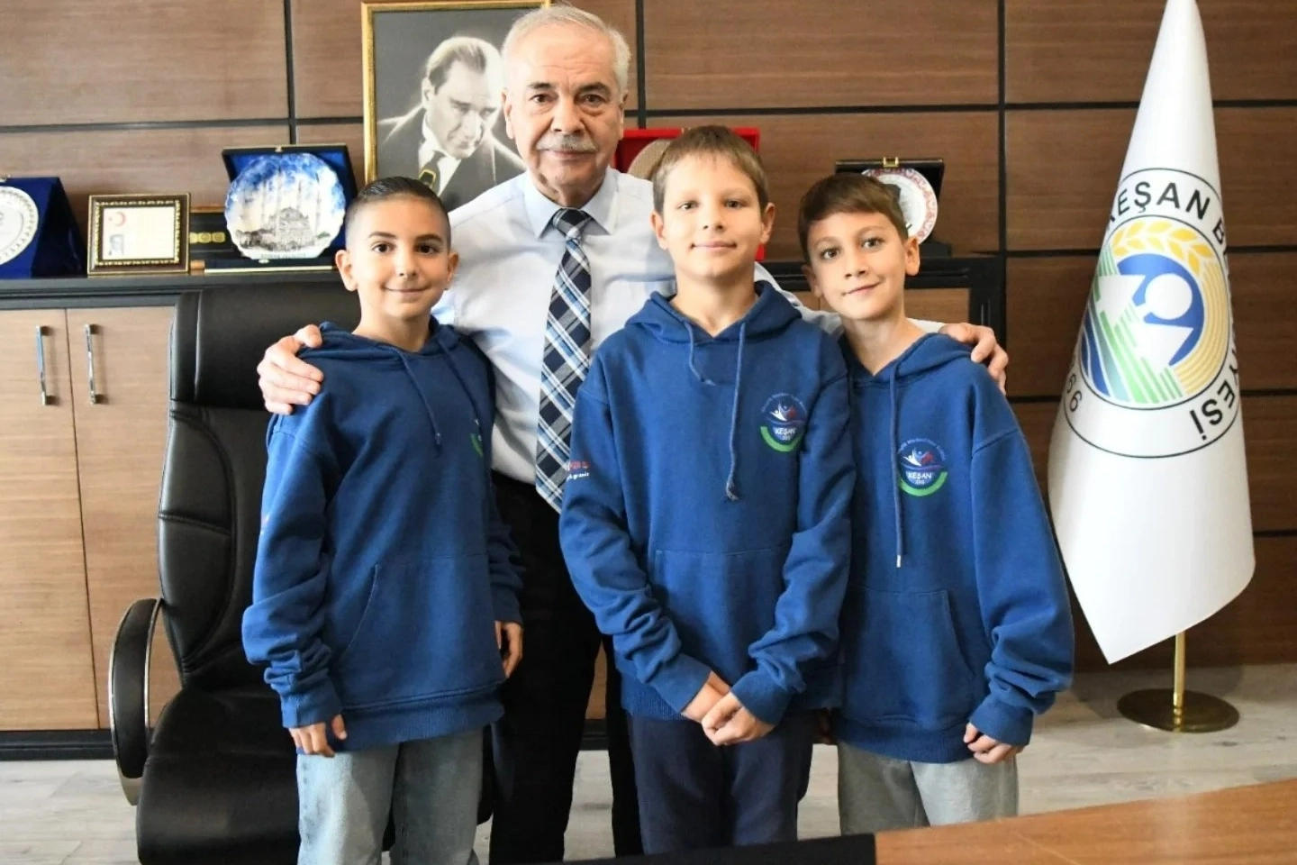Şampiyonada dereceye giren Anafartalar İlkokulu öğrencileri Yaman Ergene ve Mehmet Yağız Gürsoy ile Raşit Efendi İlkokulu öğrencisi Mehmet Uras Engin, Keşan Belediyesi tarafından makamda ağırlandı.