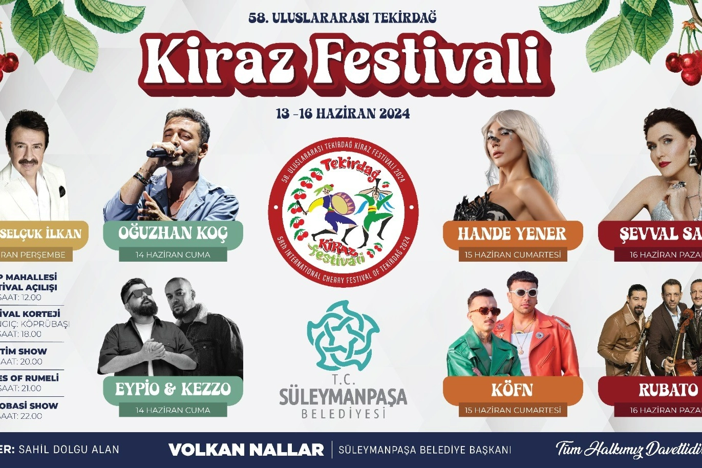 13 Haziran Çarşamba günü saat 12.00’de Naip Mahallesi’nde gerçekleştirilecek açılış ile başlayacak 58. Uluslararası Tekirdağ Kiraz Festivali’nin ilk gününde ünlü tiyatrocu, senarist ve yönetmen Müfit Can Saçıntı stand-up gösterisi ile Tekirdağlıların karşısına çıkacak. Ritim şov ve Blues Of Rumeli grubu ile ısınacak gecede finali binlerce şiiri, altı kitap 10 şiir albümü ile şarkı sözü yazarlığında da zirveye çıkan Ahmet Selçuk İlkan yapacak. 14 Haziran Perşembe günü rap dünyasının sevilen isimleri Eypio ile Kezzo ve yazdığı sözler, besteleri ve sesi ile pop müziğe yeni bir soluk getiren Oğuzhan Koç 58. Uluslararası Tekirdağ Kiraz Festivali’nin misafiri olacak. 15 Haziran Cuma günü elektronik pop müziğin yükselen sesi Köfn ve Türk pop müziğinin kraliçesi Hande Yener festival coşkusunu zirveye taşımak için Süleymanpaşa sahnesinde en güzel eserlerini seslendirecek. 16 Haziran Cumartesi günü festivalin kapanışında ünlü sanatçılar ile yaptıkları düetler ve 9/8 adını verdikleri albümleri ile büyük bir dinleyici kitlesine ulaşan Rubato ve sahnelerin aranan ismi Şevval Şam festivalin kapanışında kulakların pasını silecek. 58. Uluslararası Tekirdağ Kiraz Festivali’ne katılacak sanatçıların belli olması sonrası açıklamalarda bulunan Süleymanpaşa Belediye Başkanı Volkan Nallar, maddi sıkıntılara rağmen kısa sürede güzel bir festival organize etmeye çalıştıklarının altını çizerken, “Göreve başlayalı sayılı günler oldu. Bu kısa sürede bize bırakılan büyük bir borç yüküyle karşılaştık. Bu yüzden festival bütçemizi kısıtlı tuttuk. Az zamanda şehrimiz için güzel bir program hazırladık. 58. Uluslararası Tekirdağ Kiraz Festivali, başta Süleymanpaşalı, Tekirdağlı hemşehrilerim olmak üzere Türkiye’nin dört bir yanından ve çevre ülkelerden gelecek milyonlarca kişinin gönüllerince eğlenebileceği bir festival olacak. Hem geleneklerimizi yaşatıp, hem de kültürümüzü misafirlerimize aktaracağız. Aynı zamanda da şehrimize ticari girdiler sağlayacağız. Bunların üstüne eğlence dolu konserler olacak. Ben herkesi 58. Uluslararası Tekirdağ Kiraz Festivali’ne katılmaya davet ediyorum. Şimdi eğlence zamanı” ifadelerini kullandı.