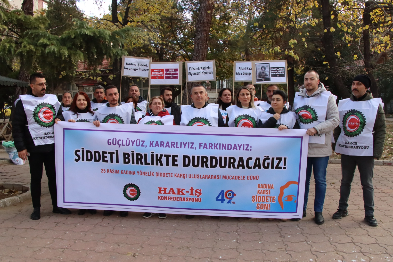 Dünya genelinde Filistin ve Gazze gibi birçok bölgede kadınlar ve çocuklar sistematik zulme maruz bırakılmaktadır. Kudüs'te, Yemen'de, Ukrayna'da, Mısır'da, Suriye'de, Arakan'da, Afrika'da, Doğu Türkistan'da kadınlar cinsel şiddet ve etnik temizlikle karşı karşıya kalmakta, yetersiz beslenme ve hastalıklardan en çok kadın ve çocuklar etkilemektedir. Kadın, çocuk, hayvan ve tüm canlılara yapılan şiddeti kınamak, kadın kardeşlerimiz adına güçlü bir ses vermek üzere büyük HAK-İŞ teşkilatı olarak kadını erkeği hep birlikte meydanlardayız. 25 Kasım Kadına Yönelik Şiddete Kaşı Uluslararası Mücadele Günü’nde HAK-İŞ'li erkek emekçiler olarak kadın emekçi kardeşlerimizle dayanışma duygularımızı dile getiriyoruz. Bizler kadına yönelik şiddetin bir acizlik olduğunu savunuyoruz."