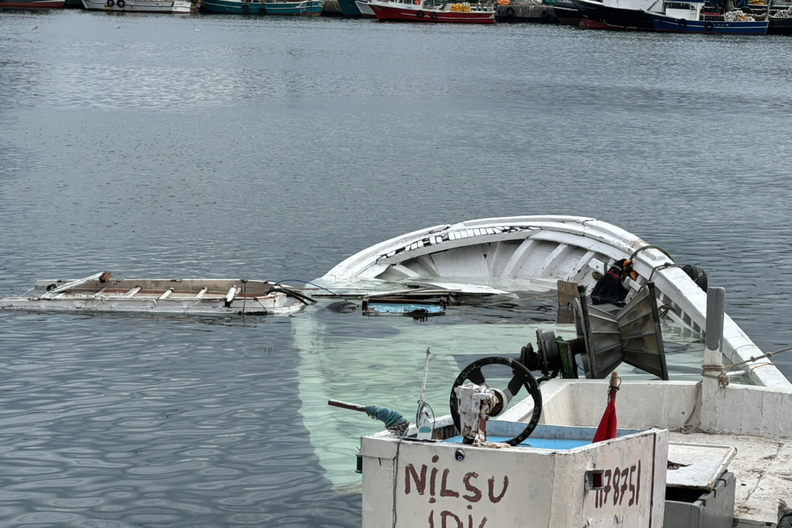 Çekilerek limana getirilen balıkçı teknesi battı.