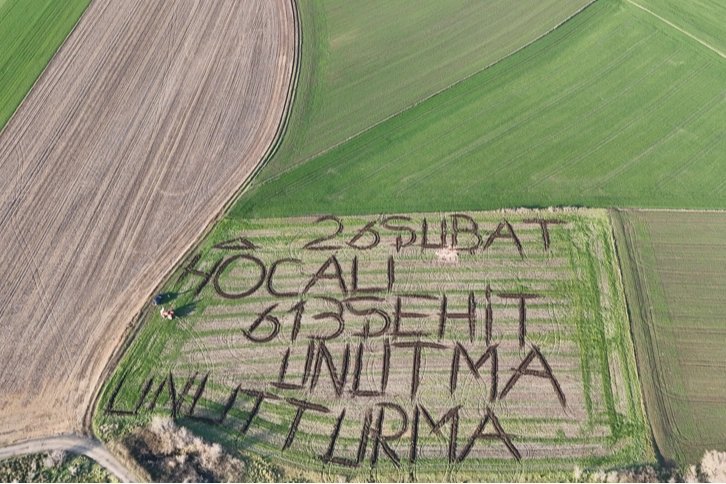 Tunçkol, traktörün pulluğuyla toprağa iz bırakarak yaklaşık 5 saatlik çalışmayla tarlasına "26 Şubat Hocalı 613 Şehit Unutma, Unutturma" yazdı.