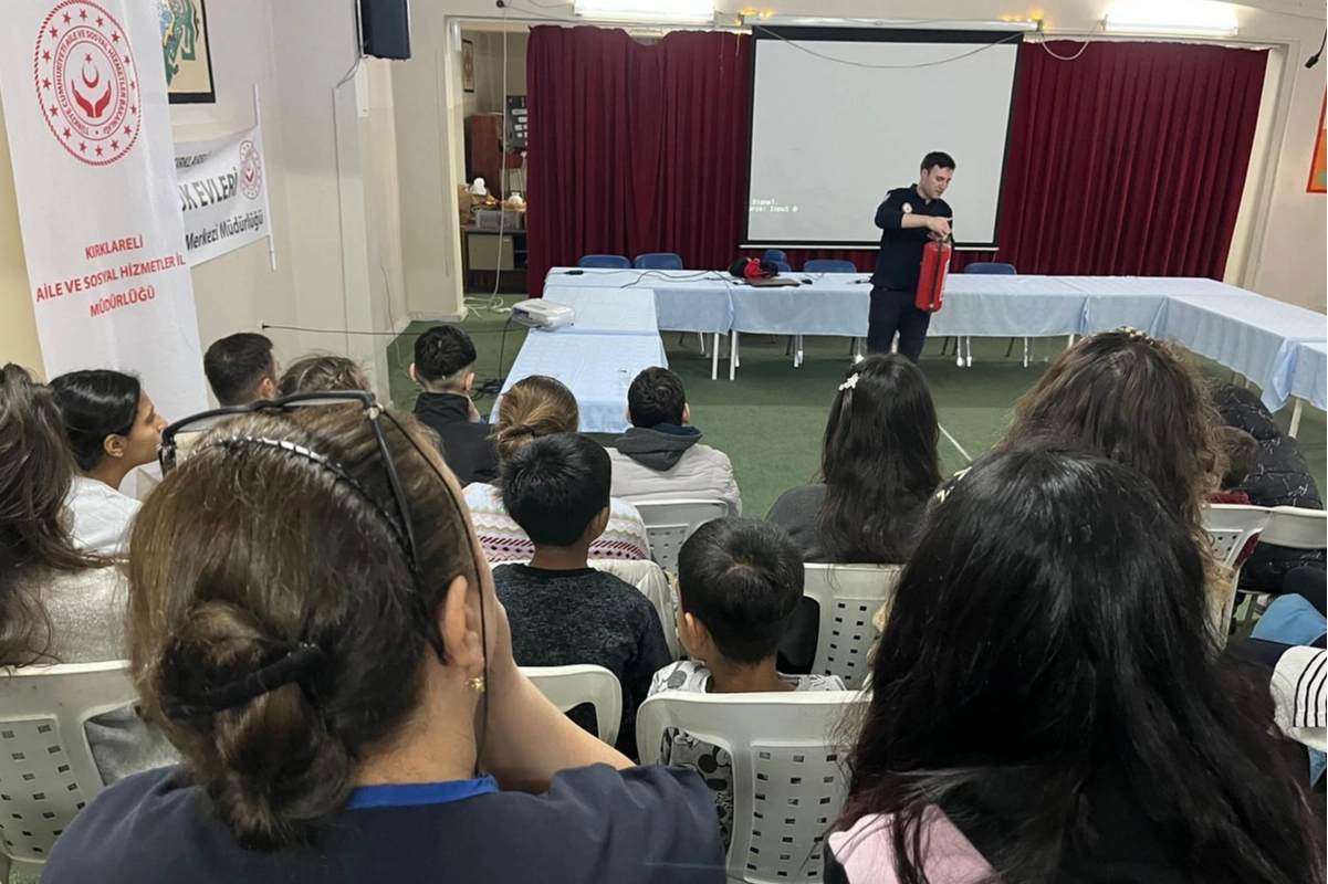 Görevli personel tarafından yangın anında ve sonrasında yapılması gerekenler hakkında çocuklar bilgilendirildi.
