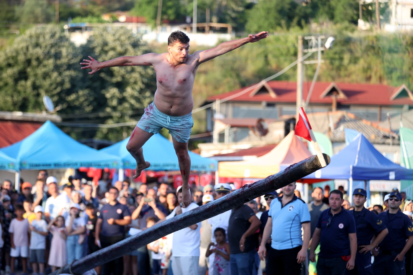 YAĞLI DİREKTEN BAYRAK ALMAK İÇİN KIYASIYA YARIŞTILARDiğer bir etkinlikte ise 8 metre uzunluğundaki yağlı direğin ucundaki Türk bayrağını almak için 15 yarışmacı mücadele etti.