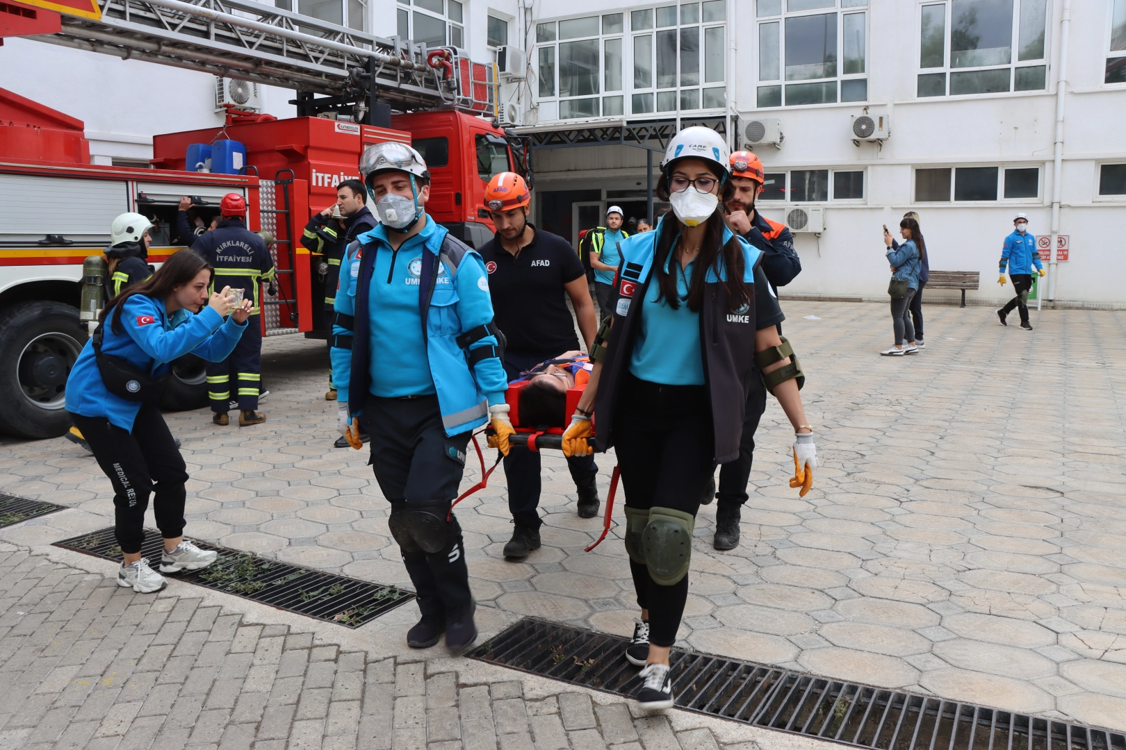 İtfaiye ekipleri çıkan yangına müdahale ederken, AFAD ekipleri aktif karbonlu koruyucu kıyafetlerle bina içinde zehirli gaz ve radyoaktif sızıntı kontrolü yaptı.