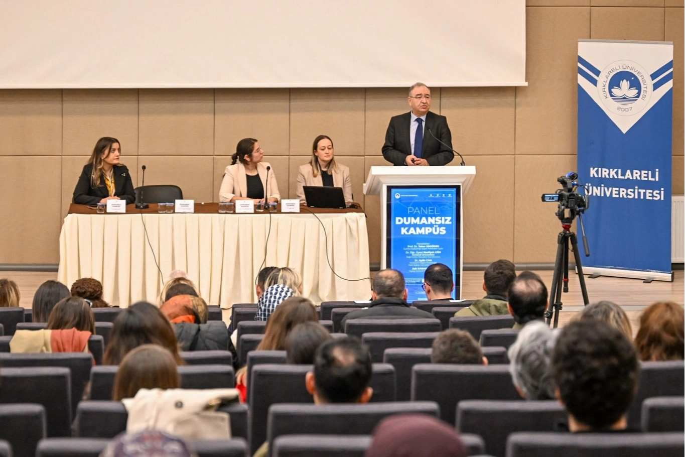 Kırklareli Üniversitesi tarafından düzenlenen ve Cumhurbaşkanlığı Sağlık Politikaları Kurulu Üyesi Prof. Dr. Toker Ergüder’in katılımıyla gerçekleştirilen “Dumansız Kampüs” paneli yoğun katılımla yapıldı. Programa Kırklareli Valisi Uğur Turan, Kırklareli Cumhuriyet Başsavcısı Özkan Levent Taşkoparan, Kırklareli Üniversitesi Rektör Vekili Prof. Dr. Meryem Çamur Demir, Cumhuriyet Başsavcı Vekili İsmet Saçlı, akademisyenler ve öğrenciler katıldı.