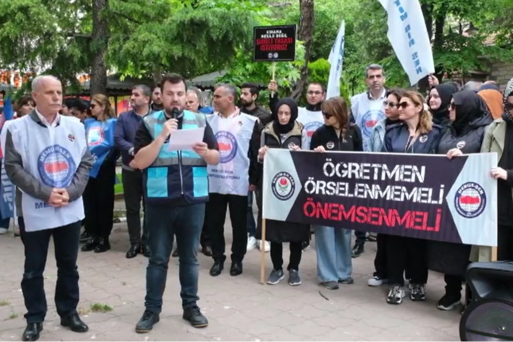Sendika üyeleri "Susma haykır, şiddete hayır", "Birleşe birleşe kazanacağız", "Öğretmeni şiddete teslim etmeyeceğiz" şeklinde slogan attı.