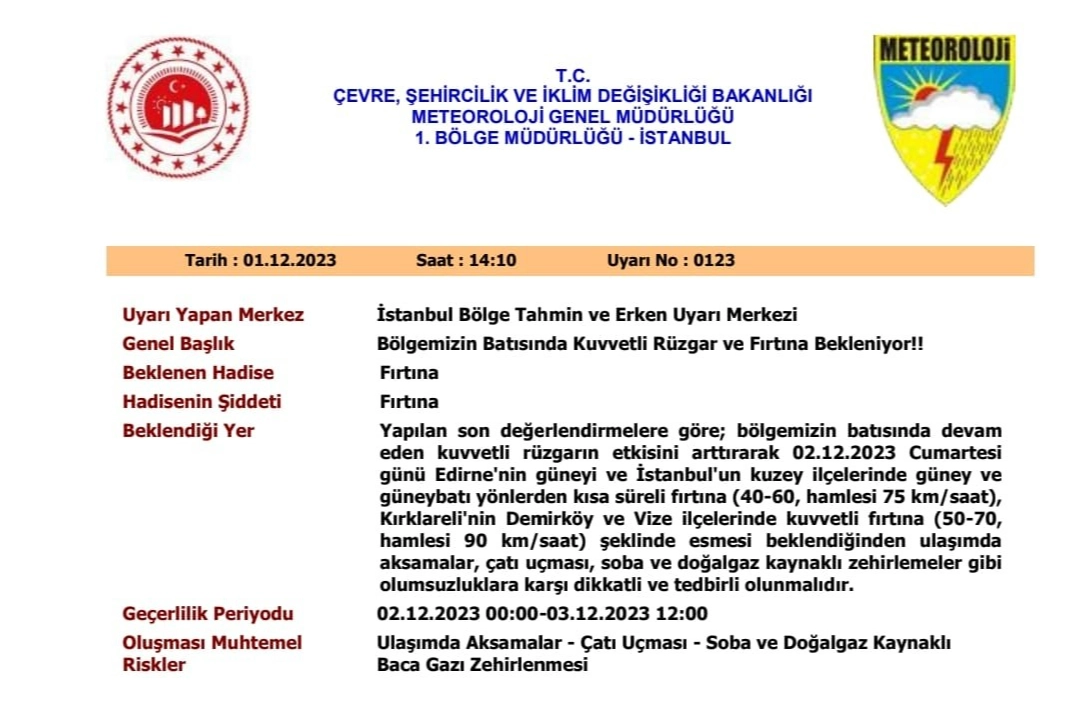 Kırklareli Valiliği de duyuruyu paylaşarak vatandaşları dikkatli olması yönünde uyardı. Kırklareli Valili tarafından yapılan açıklamada, esen rüzgarın şiddetini arttıracağı yönünde bilgi verilerek, Cumartesi gününe dikkat çekildi. Açıklamada, “Bölgemizin batısında devam eden kuvvetli rüzgârın etkisini arttırarak 2 Aralık 2023 Cumartesi günü Edirne’nin güneyi ve İstanbul’un kuzey ilçelerinde güney ve güneybatı yönlerden kısa süreli fırtına 40-60, hamlesi 75 km/saat), Kırklareli’nin Demirköy ve Vize ilçelerinde kuvvetli fırtına 50-70, hamlesi 90 km/saat şeklinde esmesi beklendiğinden ulaşımda aksamalar, çatı uçması, soba ve doğal gaz kaynaklı zehirlenmeler gibi olumsuzluklara karşı dikkatli ve tedbirli olunmalıdır” bilgilerine yer verildi. Açıklamada ayrıca, ulaşımda aksamalar, çatı uçması, soba ve doğal gaz kaynaklı baca, gaz zehirlenmeleri muhtemel riskler arasında değerlendirildi. Meteorolojik değerlere göre 62-74 km/saat hızındaki rüzgâr fırtına olarak, 75-88 km/saat hızındaki rüzgâr kuvvetli fırtına olarak, 89-102 km/saat hızındaki rüzgâr ise tam fırtına olarak değerlendiriliyor.