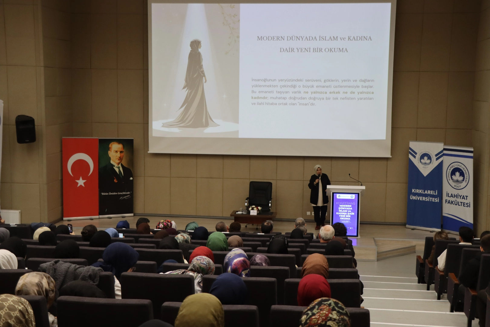 İlahiyat Fakültesi Dekanı Prof. Dr. Mustafa Canlı, Kayalı Yerleşkesi Prof. Dr. Mustafa Aykaç Salonu'nda gerçekleştirilen konferansta, Allah'ın evrene lütfettiği en değerli varlıklardan birinin kadın olduğunu belirtti.