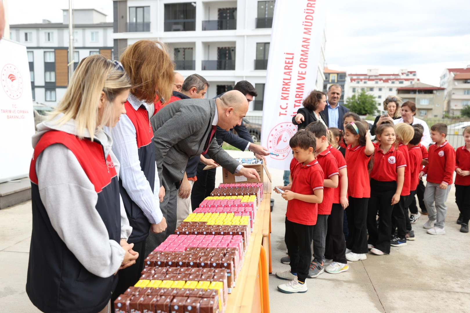 Konuşmaların ardından Özefsun ve Karaca öğrencilere süt dağıttı.