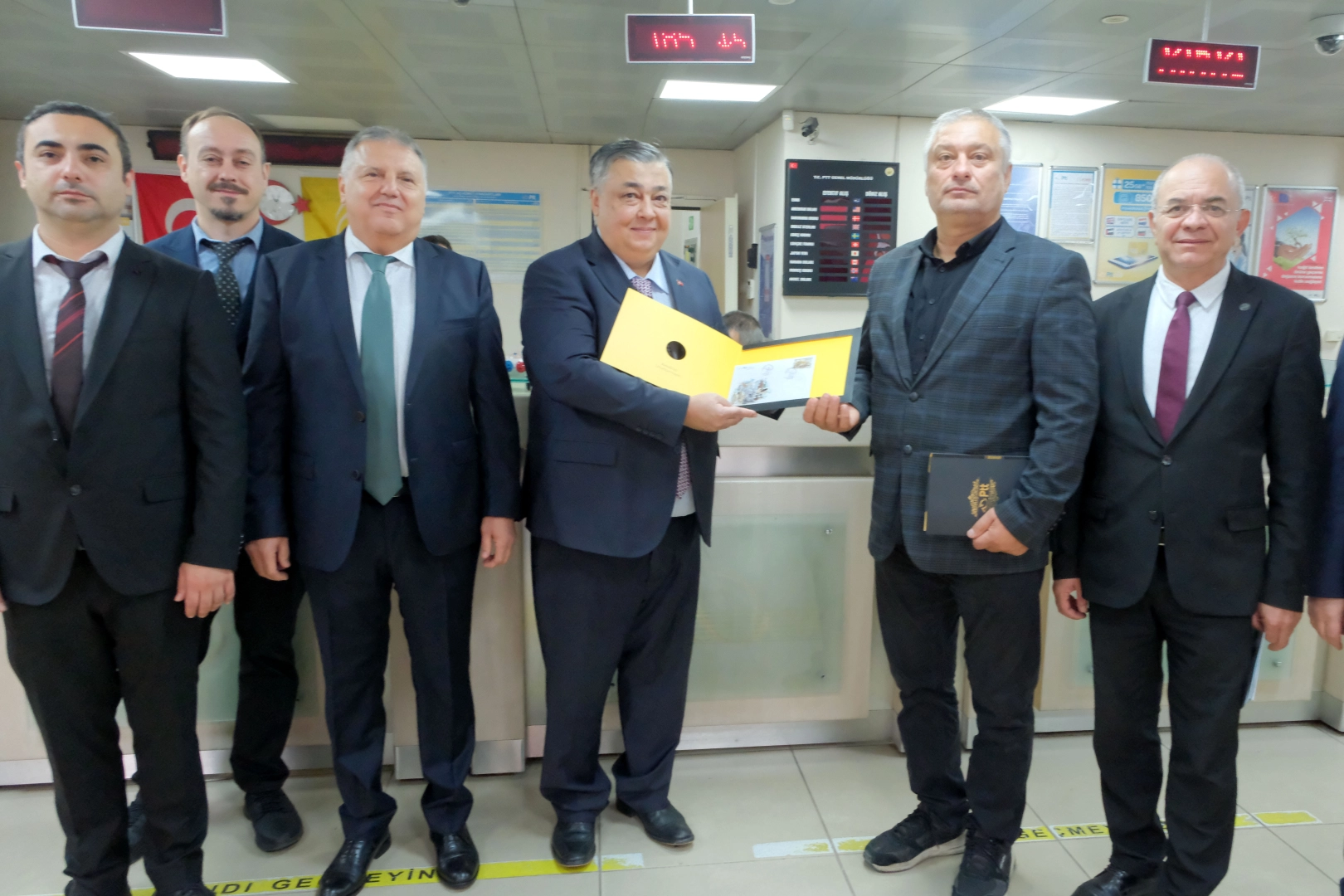 Kırklareli Vali Vekili Yusuf Güler, yıl dönümü etkinlikleri kapsamında 185. müşteri Ufuk Topuz'a, Cumhuriyet'in 102. yılı dolayısıyla hazırlanan pul serisi hediye etti.