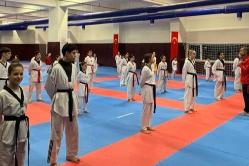 Taekwondocular bir üst kuşağa geçmek için mücadele etti.