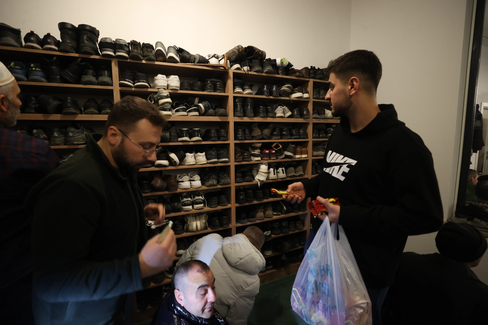 Namazın ardından ayakkabısının içinde harçlık ve gofret olduğunu fark eden çocuklar mutlu oluyor.
