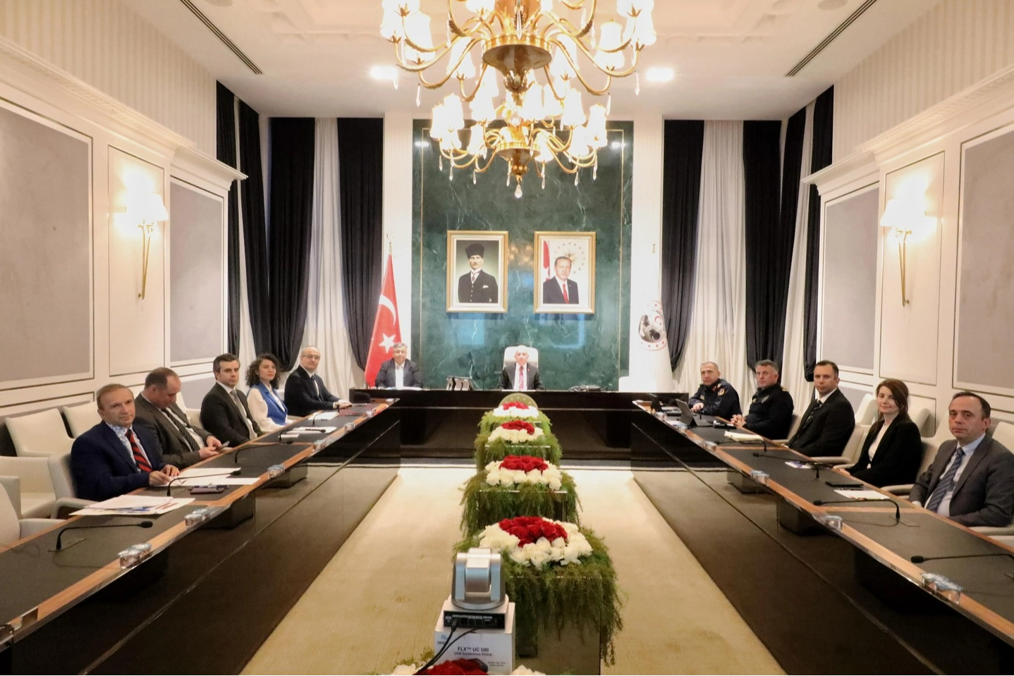 Kırklareli Valiliği Atatürk Toplantı Salonu'nda, yangın güvenliği ve iş sağlığı güvenliği konularını ele alan bir toplantı gerçekleştirildi. Toplantıya, Vali Uğur Turan başkanlık ederken, mülki idare amirleri, genel kolluk kuvvetleri ve ilgili kurumların temsilcileri videokonferans yöntemiyle katıldı.