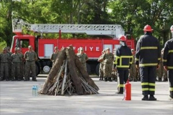 Orgeneral Haydar Sükan Kışlası'nda gerçekleştirilen tatbikatta, itfaiye çavuşu Sinan Gebecik tarafından Mehmetçiğe yangın tüpünün kullanımı ve söndürme teknikleri eğitimi verildi.