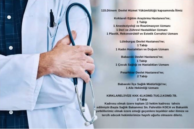 Konuya ilişkin Kırklareli İl Sağlık Müdürlüğü'nden yapılan açıklamada, “115. Dönem Devlet Hizmet Yükümlülüğü çerçevesinde ilimiz Kırklareli Eğitim Araştırma Hastanesi'ne 1 tabip, 1 anesteziyoloji ve reanimasyon uzmanı, 1 deri ve zührevi hastalıkları uzmanı, 1 plastik, rekonstrüktif ve estetik cerrahisi uzmanı, Lüleburgaz Devlet Hastanesi'ne 1 tabip, 1 kadın hastalıkları ve doğum uzmanı, Babaeski Devlet Hastanesi'ne 1 tabip, 1 çocuk sağlığı ve hastalıkları uzmanı, Pınarhisar Devlet Hastanesi'ne 2 tabip, Babaeski İlçe Sağlık Müdürlüğü’ne 1 aile hekimliği uzmanı, Kırklareli/Vize KKK 41. Komando Tugay Komutanlığı’na 2 tabip kadrosu olmak üzere toplam 13 hekim kadrosu tahsis edilmiştir” denildi.