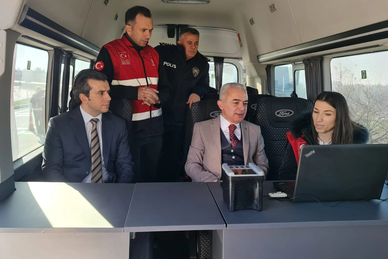 Turan, Dereköy Sınır Kapısı yolunda İl Emniyet Müdürlüğünce oluşturulan asayiş ve trafik uygulama noktasında bulunan araçtaki çalışmalar hakkında İl Göç Müdürü Ahmet Temelci'den bilgi aldı.