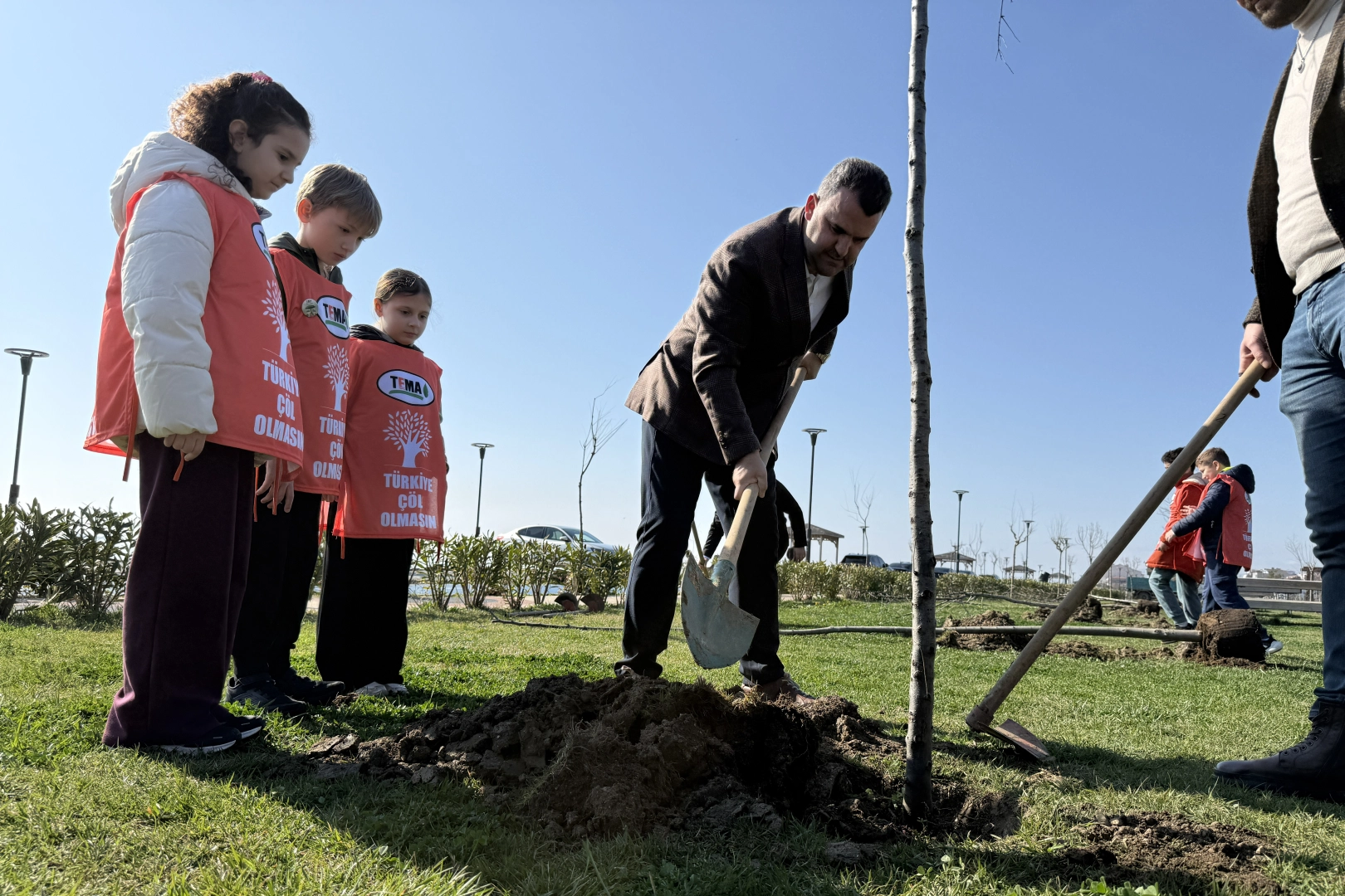 Konuşmaların ardından ilkokul öğrencileri ve protokol üyeleri fidanları dikti.