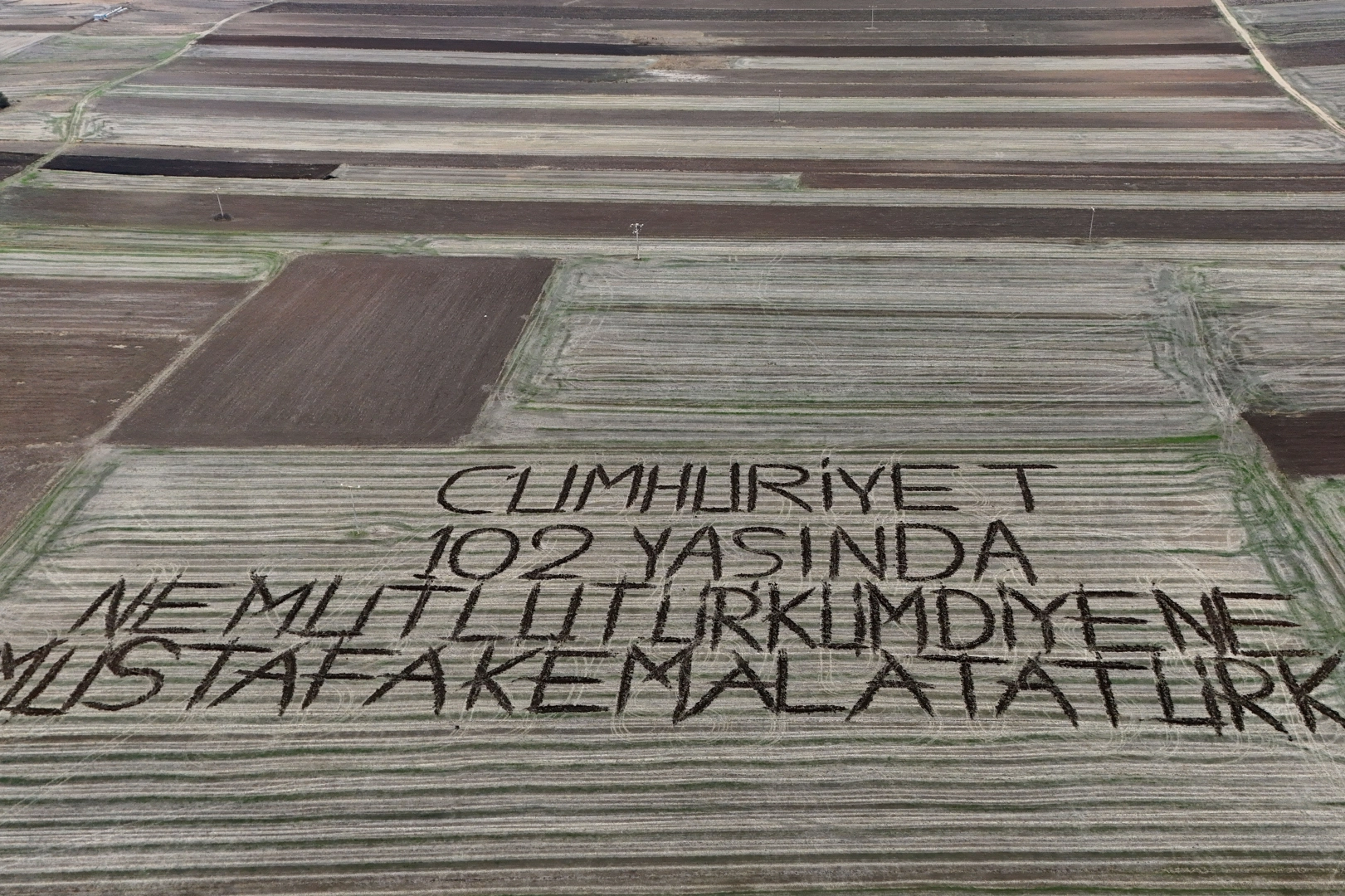 Lüleburgaz ilçesi Evrensekiz beldesinde yaşayan Burak Tunçkol (48) Cumhuriyet'in 102. yıl dönümü dolayısıyla tarlasına pullukla toprağa iz bırakarak "Cumhuriyet 102 yaşında" yazmaya karar verdi.