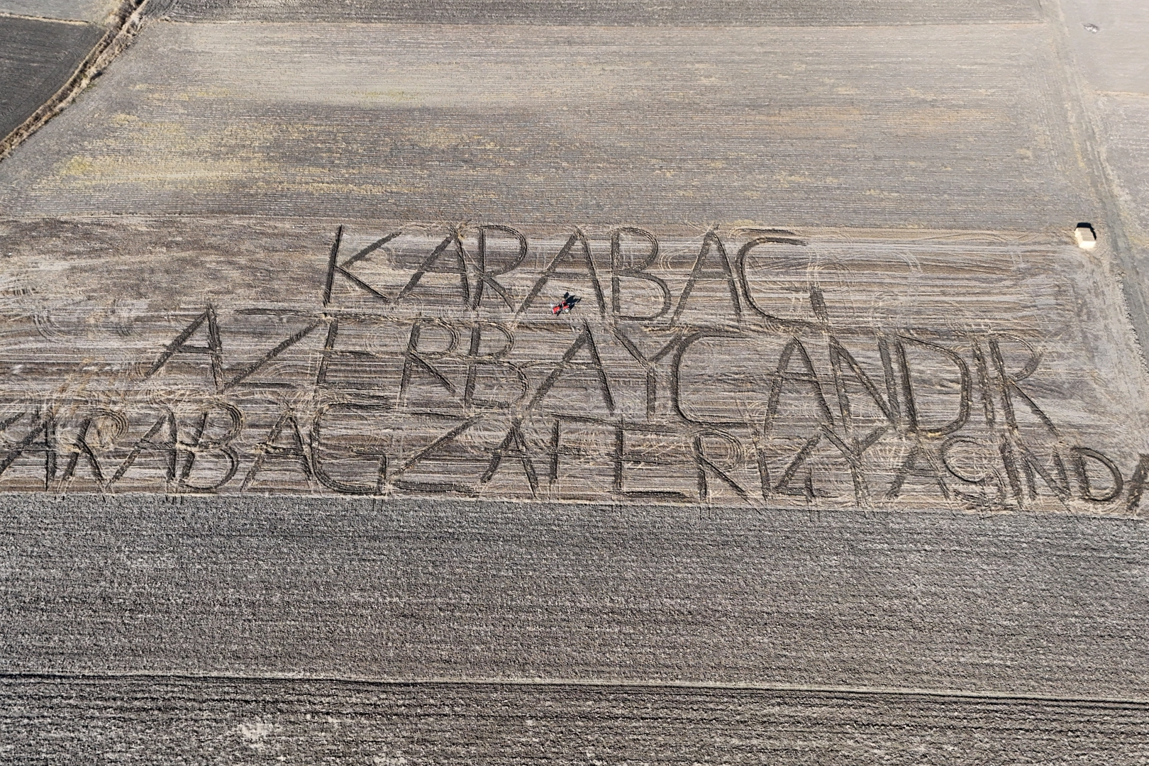 Traktörüne Türk ve Azerbaycan bayrakları asan Tunçkol, pulluk ile toprakta iz bırakarak yaklaşık 4 saatte "Karabağ Azerbaycan'dır, Karabağ Zaferi 4 Yaşında" yazdı.