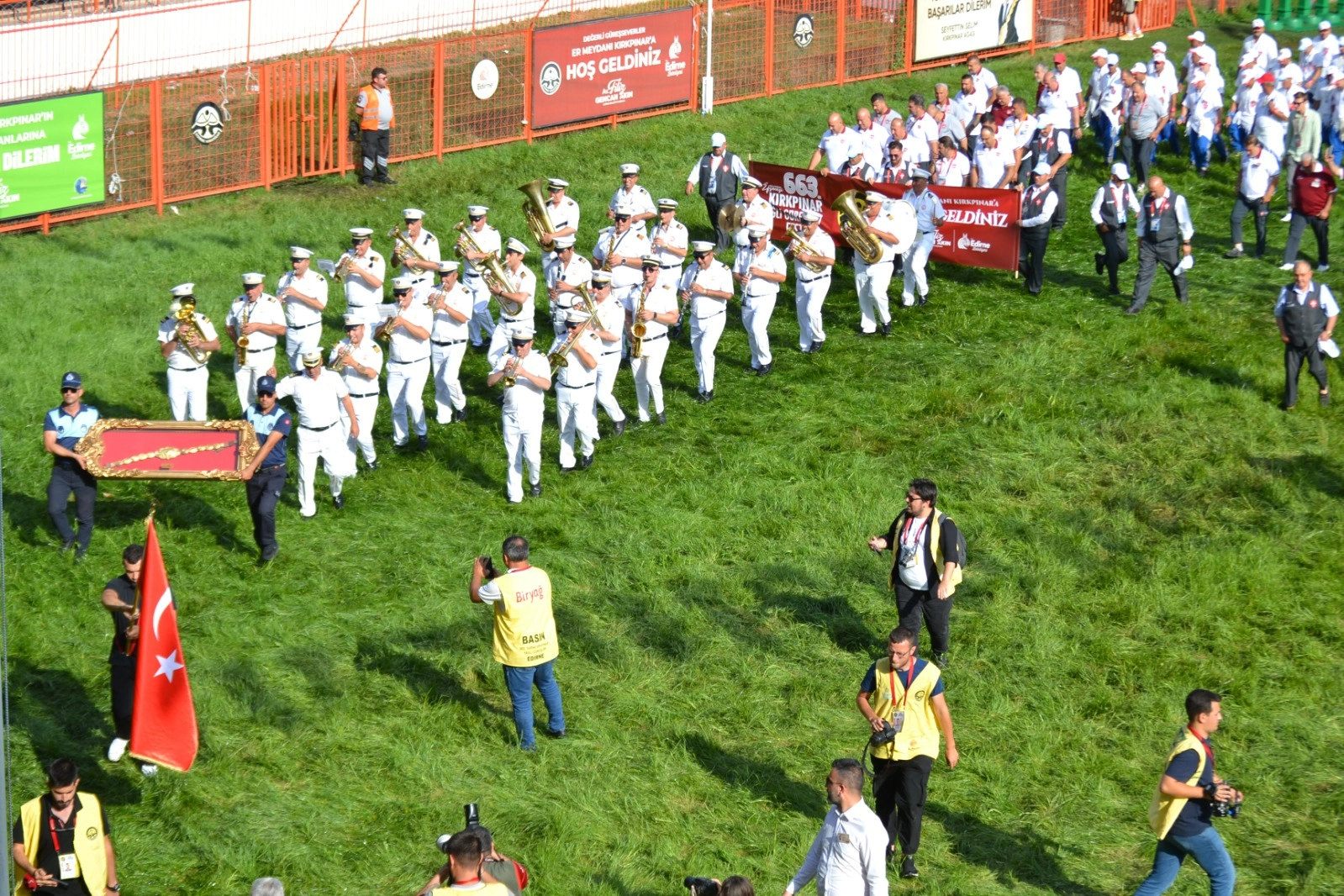Türkiye Cumhuriyeti'nin kurucusu Mustafa Kemal Atatürk, silah arkadaşları ve tüm şehitler anısına 1 dakikalık saygı duruşu ve İstiklal Marşı’nın okunması ile başlayan törende 662'nci Kırkpınar Yağlı Güreşleri başpehlivanı Yusuf Can Zeybek, Türk bayrağını göndere çekti. Törende daha sonra merhum öğretmen Beyazıt Sansı tarafından yazılan ve bestelenen Kırkpınar Marşı, Edirne Belediye Bandosu eşliğinde okundu. Marşa, Beyazıt Sansı’nın oğlu sanatçı Seven Sansı da eşlik etti.