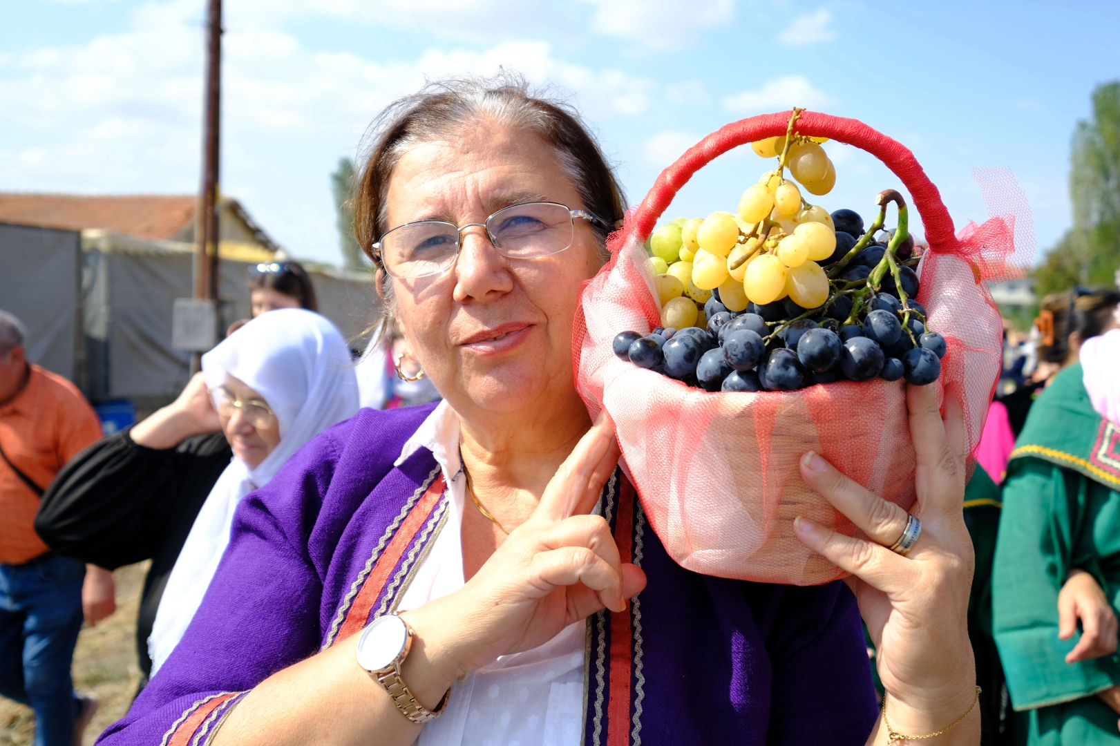 Yöresel kıyafetler giyen kadınlar da omuzlarında taşıdıkları üzüm dolu sepetler ve çömlekler ile talika eşliğinde yürüyüşe katıldı.