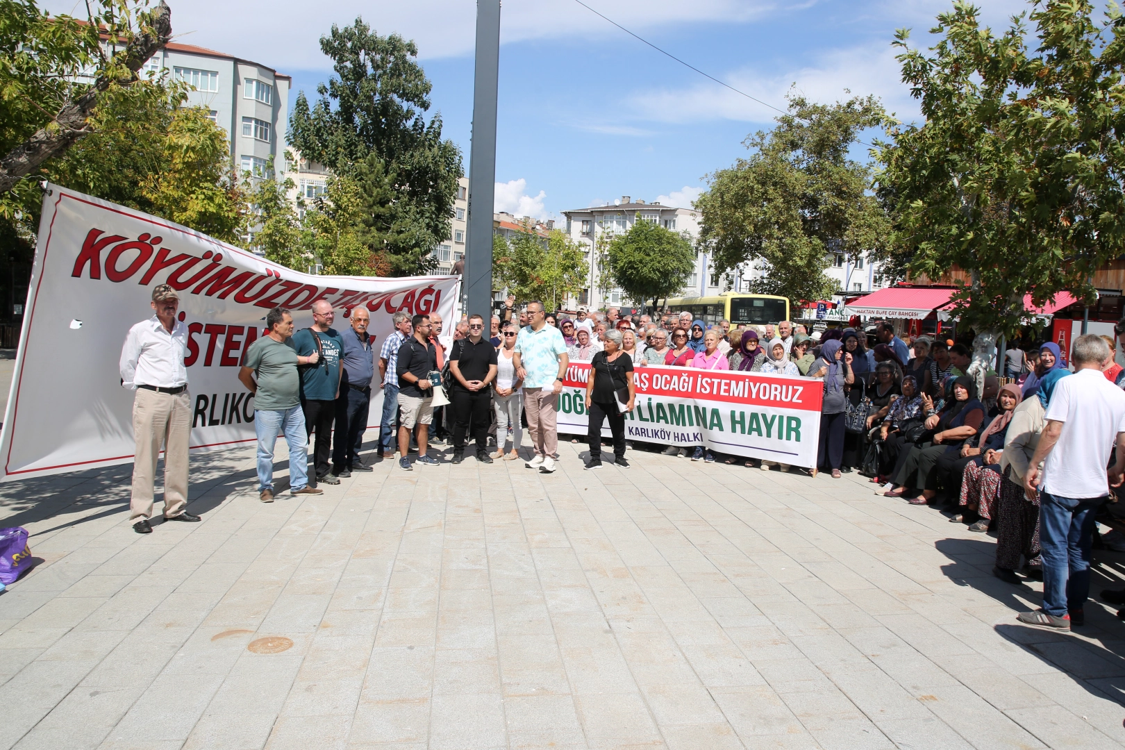 Karlıköy’de oturan Nurten Nazlı ise “Ben o köyün merasında çobanlık yaptım. Kuzu otlattım, manda ve inek güttüm. Kazlıçeşme dediğimiz bölgede o yemyeşil ağaçların altında tertemiz havayı soluyarak büyüdüm. Şimdi dedelerimizden, babalarımızdan kalan o güzelim meraya, yemyeşil ormanlarımıza, tarım arazilerimize, çiçeğimize, böceğimize, arılarımıza dokunmalarına müsaade etmemek için buradayız. Biz hep birlikte tek yürek olarak bu mücadeleye sonuna kadar devam edeceğiz” ifadelerini kullandı.