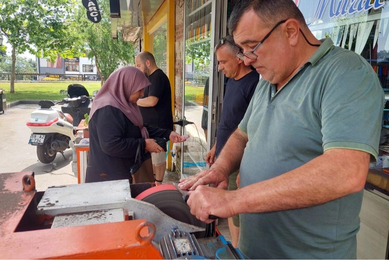 Tekirdağ’ın Süleymanpaşa ilçesinde baba mesleklerini sürdüren Murat Bıçakçı ve oğlu Alaattin Bıçakçı, Kurban Bayramı’na sayılı günler kala yoğunluğun arttığını ifade etti. Kurban Bayramı öncesi bıçakçı dükkanına gelen müşteri sayısı günbegün artarken Murat Bıçakçı, kurbanda kullanılacak bıçakların önemli olduğunu belirtti. Kurban kesiminde kullanılacak olan bıçak sayısı ve bıçakların keskinliğine dikkat edilmesi gerektiğine dikkat çeken Murat Bıçakçı, kurbanı mundar etmemek ve hayvana acı vermemek için keskin bıçak kullanılması gerektiğini belirtti. Bıçakçı açıklamasında, kurbanlığa acı çektirmeden kesimin kısa sürede yapılması gerektiğini ifade ederek, "Bıçakçılık mesleğini devam ettiriyoruz. Kurban Bayramı yaklaşıyor. Biz de bilemeye devam ediyoruz. Bu sene erken başladı yoğunluk ve bileme işlemleri. Herhalde artık yavaş yavaş akıllanıyoruz. Bu sene aşağı yukarı 15 günden beridir bıçak bilemeye devam ediyoruz" dedi. Kurban bıçaklarının keskin olması gerektiğine de dikkat çeken Bıçakçı, "Kurban bıçakları kesim bıçakları, yani boğazlama denilen bıçaklar, sıyırma bıçağı, yüzme bıçağı diye 3-4 gruba ayrılıyor. Ama ne olursa olsun kurbanın bilinçli kişiler tarafından kesilmesi lazım ve bıçağın da keskin olması lazım. Kurban normal bir hayvan kesimi değil. Bıçak keskin olacak iş bitecek. Bıçağın keskin olması demek hayvana acı vermemek demek. Kurbanı mundar etmemek demek. Her bıçak ile her hayvan kesilmez. Bıçağın üslubu olsun, tutma şekli olsun. Önemli olan hayvana eziyet etmemek, hayvana can çekiştirmeden bir seferde o boğazı almak. Her yerden bıçak alınmak mesele marketten bıçak alınmaz. Bu peynir değil, domates değil. Markete nasıl iyi bir ustanın bıçağı düşer ki. Biz 1 yıl boyunca iyi bıçak topluyoruz, sonra kurbanda satışa sunuyoruz" diye konuştu.
