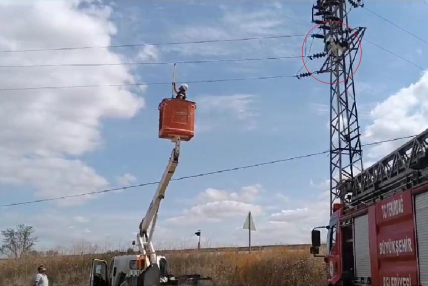 Çorlu - Süleymanpaşa yolu üzeri Yenice Mahallesi mevkiinde yoldan geçen vatandaşlar, yüksek gerilim hattında bir leyleğin asılı kaldığını fark etti. Duyarlı vatandaş, itfaiyeyi arayıp leyleğin kurtarılması için yardım talep etti.